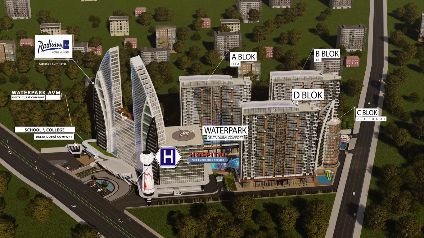 Delta Dubai Comfort Water Park AVM Karma Projesi, güvenli ve konforlu, yüksek yaşam standardı sunan konut, ofis, hastane, okul, kültür merkezi, otel ve ticari ünitelerden oluşmaktadır. Projede 7 Blok ve 1.250 bağımsız bölüm bulunmaktadır.